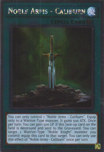 You can only control 1 "Noble Arms - Caliburn". Equip only to a Warrior-Type monster. It gains 500 ATK. Once per turn: You can gain 500 LP. If this face-up card on the field is destroyed and sent to the Graveyard: You can target 1 Warrior-Type "Noble Knight" monster you control; equip this card to that target. You can only use this effect of "Noble Arms - Caliburn" once per turn.
