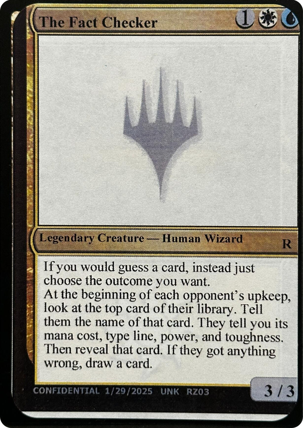 At the beginning of each opponent's upkeep, look at the top card of their library. Tell them the name of that card. They tell you its mana cost, type line, power, and toughness. Then reveal that card. If they got anything wrong, draw a card.