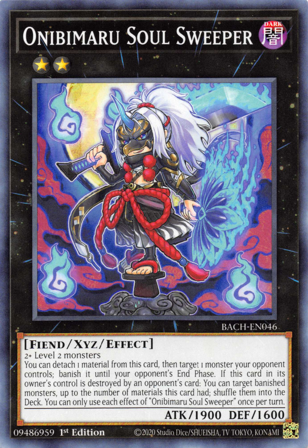 2+ Level 2 monsters You can detach 1 material from this card, then target 1 monster your opponent controls; banish it until your opponent's End Phase. If this card in its owner's control is destroyed by an opponent's card: You can target banished monsters, up to the number of materials this card had; shuffle them into the Deck. You can only use each effect of "Onibimaru Soul Sweeper" once per turn.