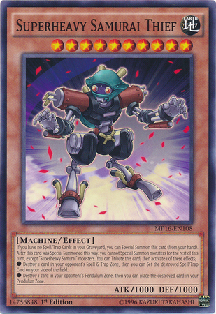 If you have no Spell/Trap Cards in your Graveyard, you can Special Summon this card (from your hand). After this card was Special Summoned this way, you cannot Special Summon monsters for the rest of this turn, except "Superheavy Samurai" monsters. You can Tribute this card, then activate 1 of these effects; •Destroy 1 card in your opponent's Spell & Trap Zone, then you can Set the destroyed Spell/Trap Card on your side of the field. •Destroy 1 card in your opponent's Pendulum Zone, then you can place the destroyed card in your Pendulum Zone.