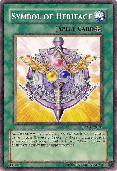 Activate only while there are 3 Monster Cards with the same name in your Graveyard. Select 1 of those monsters, Special Summon it, and equip it with this card. When this card is destroyed, destroy the equipped monster.