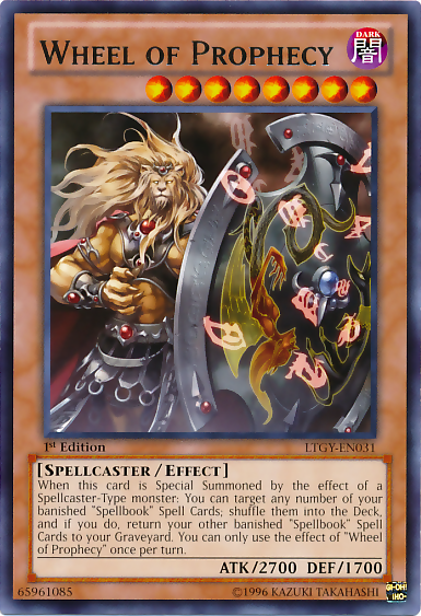 When this card is Special Summoned by the effect of a Spellcaster-Type monster: You can target any number of your banished "Spellbook" Spell Cards; shuffle them into the Deck, and if you do, return your other banished "Spellbook" Spell Cards to your Graveyard. You can only use the effect of "Wheel of Prophecy" once per turn.