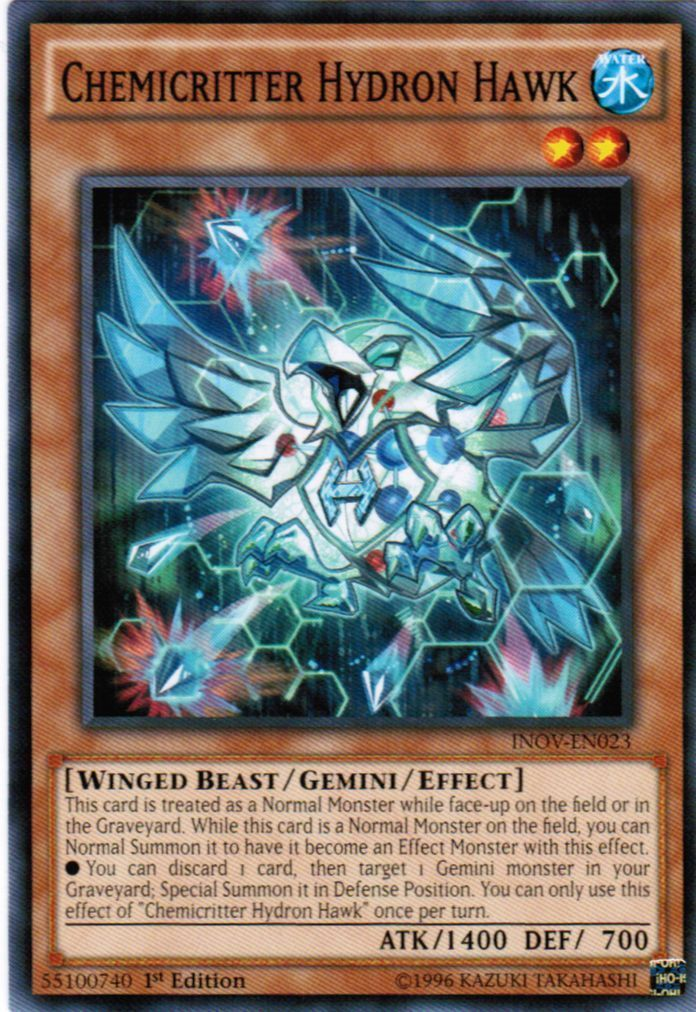 This card is treated as a Normal Monster while face-up on the field or in the Graveyard. While this card is a Normal Monster on the field, you can Normal Summon it to have it become an Effect Monster with this effect. •You can discard 1 card, then target 1 Gemini monster in your Graveyard; Special Summon it in Defense Position. You can only use this effect of "Chemicritter Hydron Hawk" once per turn.