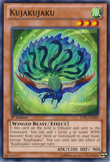 If this card on the field is Tributed and sent to the Graveyard: You can add 1 level 4 or lower WIND monster from your Deck or Graveyard to your hand except "Kujakujaku". You can only use the effect of "Kujakujaku" once per turn.